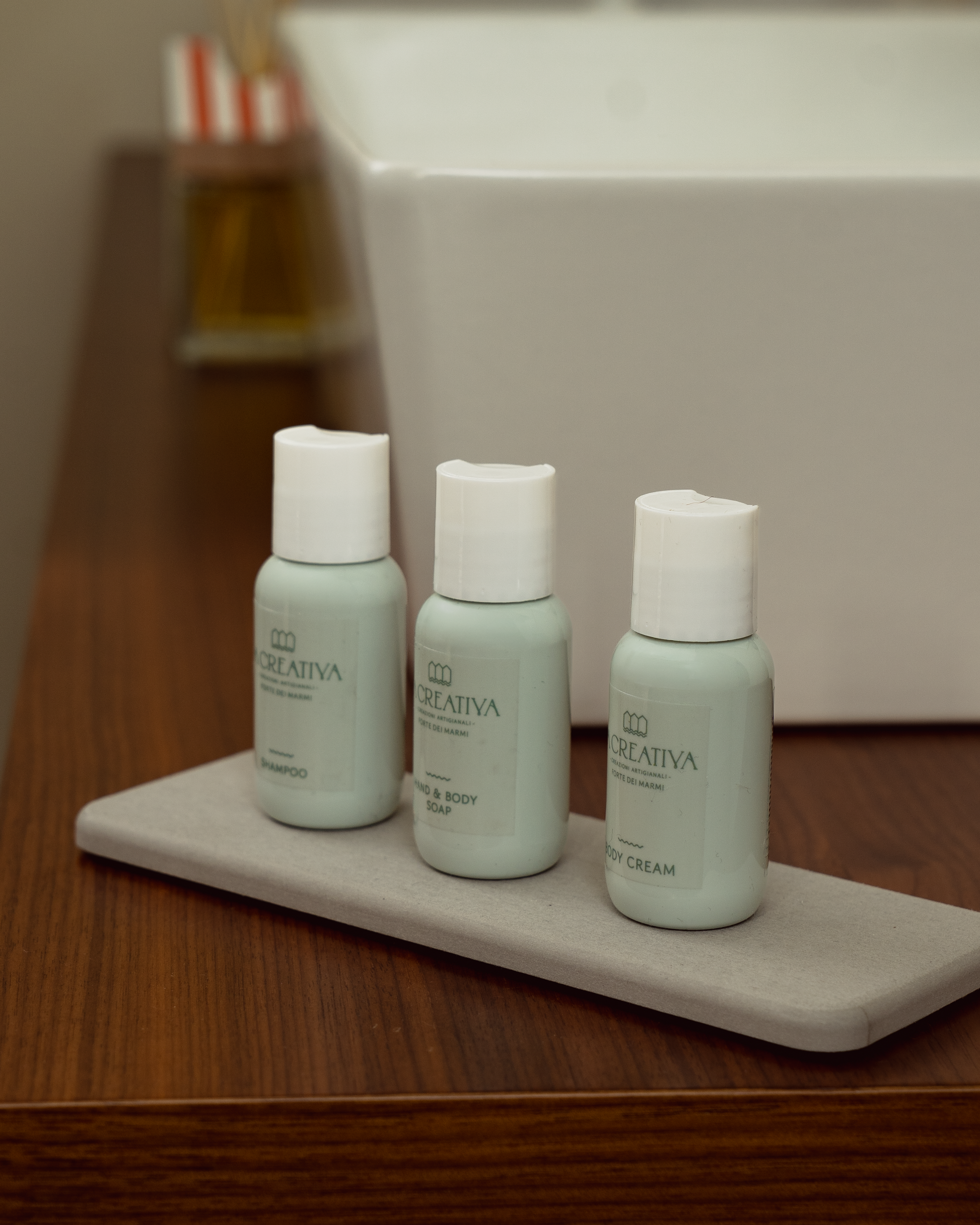 Il set cortesia firmato La Creativa nasce per accompagnare ogni gesto in una piccola esperienza sensoriale. Texture leggere, formule delicate con una fragranza ispirata al mare, e una palette che evoca eleganza discreta. Pensati per accogliere, coccolare e lasciare un ricordo. Anche nei dettagli più piccoli, vive il profumo di un’estate italiana.